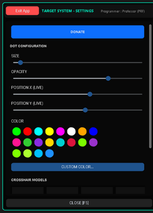 PRF Crosshair is a lightweight crosshair overlay built for FPS players who want better visual focus and control. How It Works • Press F5 to open the Settings panel. • Adjust everything in real time (size, color, model, position, opacity). • Press F5 again to close settings and return to the game. • Press F6 anytime to reset everything back to default. While the settings are open: • You … If you enjoyed this game, see our list of games similar to PRF Crosshair.