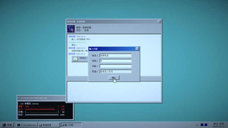 4 《见习死神》是一款以短信聊天为核心的乙女向恋爱游戏。 玩家将扮演一名刚刚上岗的女性死神,你没有镰刀,也不收割生命,却要负责阻止人类异常的自我终结行为。 你的第一个任务对象,是一位算得上社会精英却对生活失去希望的青年程序员。 随着聊天的深入,他开始依赖你、信任你,甚至爱上你。 而你将面对一个问题:你能回应这份感情吗? 你的每一次对话都可能改变他的命运,你可以陪伴他走出深渊,也可能亲手将他推入黑暗。 游戏特色: 1 沉浸式短信互动系统:模拟真实聊天界面,多种发言选项,营造轻松幽默的聊天氛围。 2 恋爱互动体验:从暧昧期到恋人期逐步推进,支持互赠礼物和视频通话。 3 情绪变量系统:希望值、健康值、好感值将共同决定角色行为与结局。 4 编程解谜玩法:利用死神的能力,深入男主的梦境世界,了解他的过往。 (没错这是一个劝学游戏,要用编程知识解谜。) 5 多结局分支:你的…