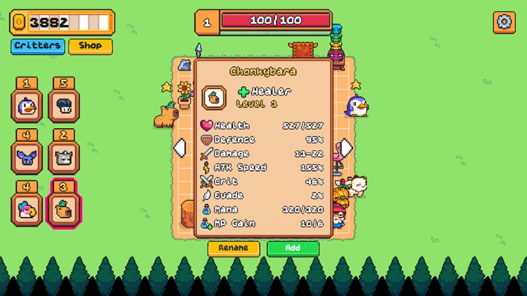 Build Your Battle Farm Design your strategy on a living grid. Place crops, relics, and powerful objects that shape your team’s stats, abilities, and synergies. Every tile matters. Grow Stronger Every WavePlant crops that grow with each survived wave. Feed your Critters to gain permanent stat boosts and adapt your build as the danger escalates. Assemble Your Dream Team Choose up to 6 Critters p… If you enjoyed this game, see our list of games similar to Critter Tactics.
