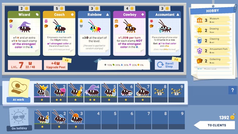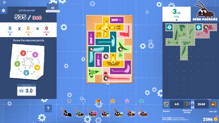 Roach Post is a strategic puzzle game where you place magical polyomino stamps on parcels to earn points and ensure successful deliveries. Stamps interact based on their colors: correct placements strengthen your magic, while mistakes weaken it. A mischievous pixie makes things harder, testing your skills with every run. Progress through ranks, refine your strategy, and become the best in the magi… If you enjoyed this game, see our list of games similar to Roach Post.