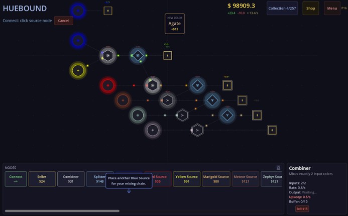 Huebound is an abstract idle factory game about mixing colors. Place geometric nodes on an infinite canvas, wire them together, and watch colored orbs flow through your network. Blue, Red, and Yellow sources generate primary orbs. Combiners mix them using subtractive color rules — just like real paint. Sellers convert orbs into Light, your currency. Spend Light to expand your factory, unlock … If you enjoyed this game, see our list of games similar to Huebound.