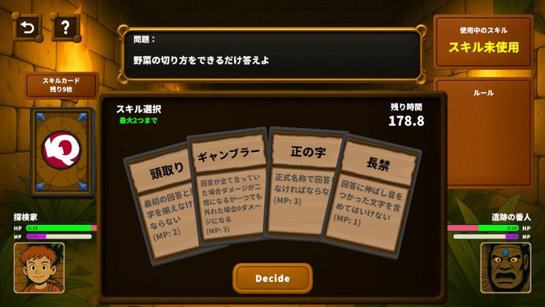 LLM×Quiz — A New Kind of Quiz Battle Adventure with AI! Guided by his grandfather’s journal, a young boy explores a legendary ruin. The moment he discovers the treasure, a stone guardian awakens: "Prove your knowledge!" LLM×Quiz fuses quiz and card battle into a turn-based adventure. Use your skill cards and knowledge to outsmart an AI opponent. The more accurate and meaningful y… If you enjoyed this game, see our list of games similar to LLM×Quiz.