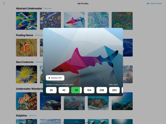 Puzzle+ is just like a real jigsaw on your iPad! Just the way you like it. More than 1000 pieces game. Ability to add your own images. We've created this app for you to make it possible to play your favorite game anywhere and anytime. It fully simulates the real puzzles and, at same time, the app uses all advantages of iPad to make the playing of your favorite game as convinient as it has ever … If you enjoyed this game, see our list of games similar to Jigsaw Puzzles Underwater.