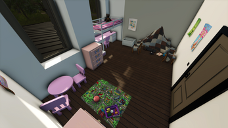 This is a detailed Farmhouse with Sleep and Wardrobe functions. This house contains 3 bedrooms and 2 full bathrooms along with a detached garage and a large back deck. The trampoline can be moved around using super strength. Also the firepit out back is functional using a nearby trigger. If you enjoyed this game, see our list of games similar to House 3Bed2Bath Ranch.