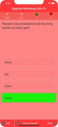 Explore and discover of the Egypt Gods/Goddesses and Myths and learn about Egyptian Mythology and Legends. Test and improve your knowledge answering the multiple choice questions about Egypt Mythology with this app. FEATURES: - No internet connection is needed. - There is no time line. Feel free while answering questions. - Follow correct, incorrect answers while playing quiz. - You can follow q… If you enjoyed this game, see our list of games similar to Egypt Mythology & Legends.