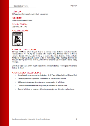 10 A narrative document of a fictional game idea based on the book of Joe Hill, Heart-Shaped Box . This document is only meant to be a representation of abilities, it is not a consent representation of the book's story. The software used: Microsoft Word. *The document is written in Spanish.*