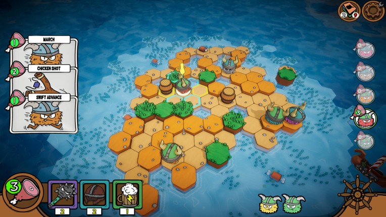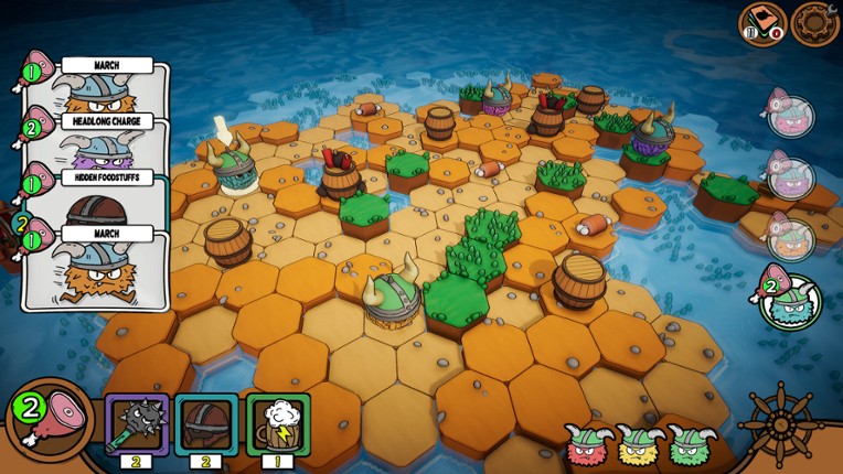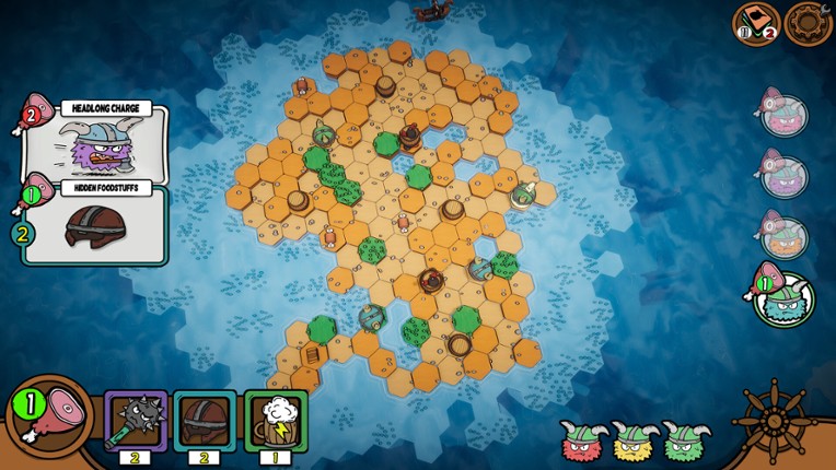Welcome to Viking Nudgers! In this game, you play with cards and try to push your enemies off from the island. Here, you do not hit or seriously hurt your enemies; instead, you try to throw them into the water. If all the enemies end up in the water, the island is yours to take. You play on a hex board, which means there are six directions from which you can plan your attack or be attacked. If yo… If you enjoyed this game, see our list of games similar to Viking Nudgers.
