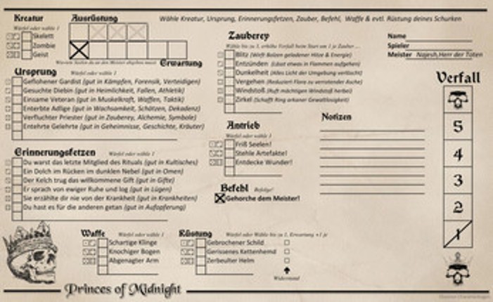 10 Princes of Midnight ist ein gemeinsames Erzähl-Rollenspiel über eine Gruppe von Verdammten, die die gefährlichen Aufträge ihres dunklen Meisters erfüllen müssen um die Mächte des Lichts zu stürzen. Die Mächte des Lichts sind schwach! Ihr seid vom dunklen Meister wiedererweckt worden. Nun ist es an euch, seinem Willen zu folgen, und euch in unzähligen Missionen zu beweisen. Kämpft für den Meist…