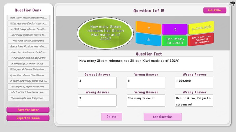 Robot Trivia Funtime is a multiplayer trivia game for PC. Play in lobbies with up to 6 people or against AI, and use the built-in editor to create, download, and select question packs, for a custom multiplayer trivia experience! There is no paid DLC; the question packs and editor come as standard. Robot Trivia Funtime comes with several hundred questions by default, with free expansions pla… If you enjoyed this game, see our list of games similar to Robot Trivia Funtime.