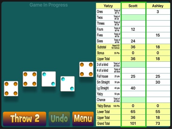 The object of the game is to score the most points by rolling five dice to make certain combinations. The dice can be rolled up to three times in a turn to try to make one of the thirteen possible scoring combinations. A game consists of thirteen rounds during which the player chooses which scoring combination is to be used in that round. Once a combination has been used in the game, it cannot be … If you enjoyed this game, see our list of games similar to Yatzy for iPad.