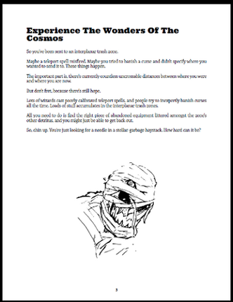 So you've been sent to an interplanar trash zone. Maybe a teleport spell misfired. Maybe you tried to banish a curse and didn't specify where you wanted to send it to. These things happen. The important part is, there's currently countless uncrossable distances between where you were and where you are now. But don't fret, because there's still hope. Lots of wizards cast poorly calibrated teleport … If you enjoyed this game, see our list of games similar to Bite-Sized Dungeon Crawl #4 - Exiles From The Interplanar Trash Zone.