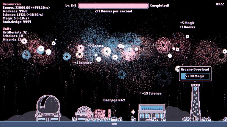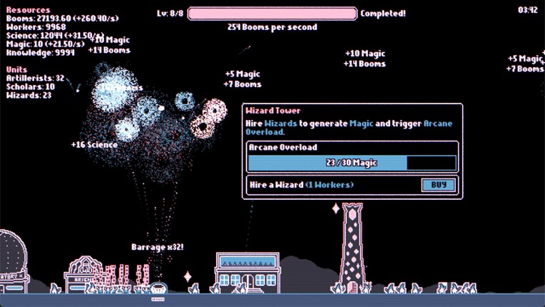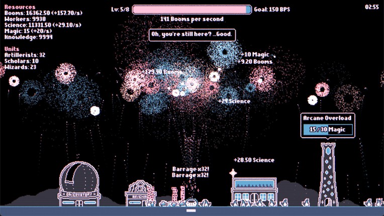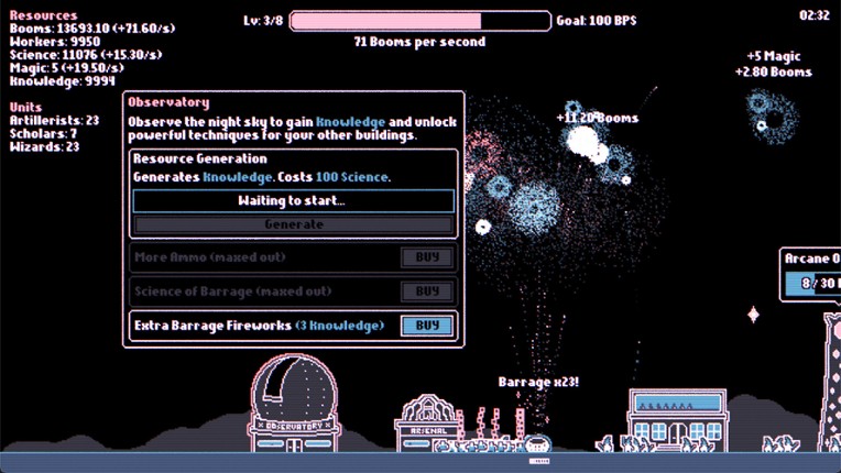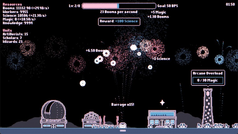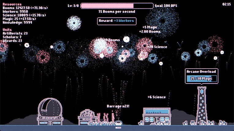 Fireworks Incremental is an incremental game about fireworks. You start small with a single mortar firing small fireworks. Each explosion generates Booms - your main currency, which you can spend on new, specialized units, new buildings and powerful upgrades to make even bigger, better and more colourful fireworks! Features Active incremental gameplay about fireworks Unlock buildings like the A… If you enjoyed this game, see our list of games similar to Fireworks Incremental.