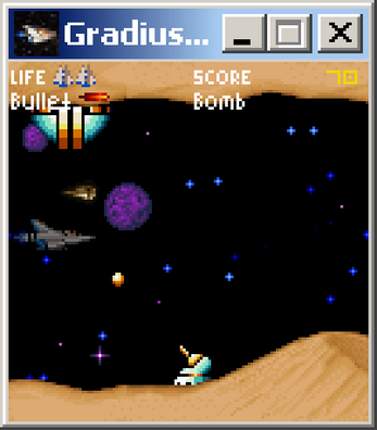 Old-school 2D space shooter! Written in pure C/C++ :) Very nice! :) Similars: Gradius3 (SNES, MAME); Gradius IV (MAME); Gradius I, II (NES); Gradius Advanced (GBA) Control Keys: Enter - start / pause Arrows - ship control Left Ctrl - firing ammo (number of shots - infinity) Left Alt - bomb drop (maximum number - three) Esc - exit the game immediately Description: The game is a 2D space sh… If you enjoyed this game, see our list of games similar to Gradius 3 Total Terror.