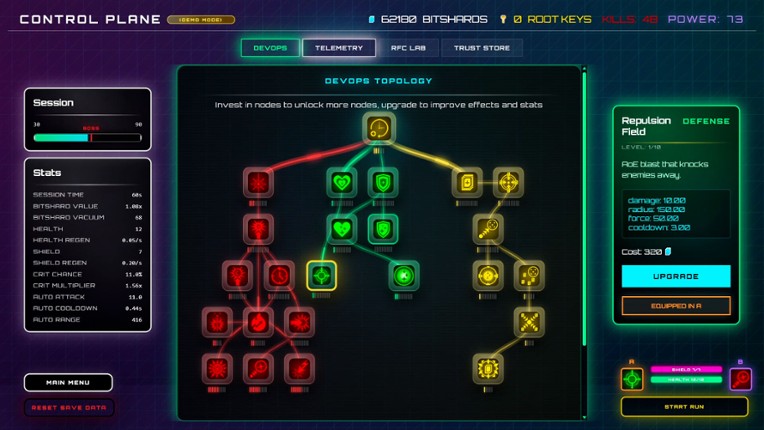 NULL ROOTYou play as a cursor controlled patch daemon defending the network from the Null corruption. Each run you will need to destroy malicious digital entities and defeat bosses whilst collecting bitshards. Between runs, you return to the control plane to unlock passive and active skills in the DevOps UI using the bitshards and root keys collected. The cursor driven movement system allows for … If you enjoyed this game, see our list of games similar to Null Root.
