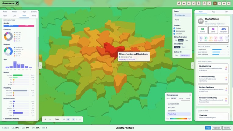 People. Power. Politics.Governance is a groundbreaking new political and social simulator that aims to fuse a real-time approach not seen in political sim with real world data, providing the most realistic simulation of modern politics. You can play as a Member of Parliament, the leader of a political party or the Prime Minister of the United Kingdom. Featuring over 1000 dynamic event, 50 unique … If you enjoyed this game, see our list of games similar to Governance.