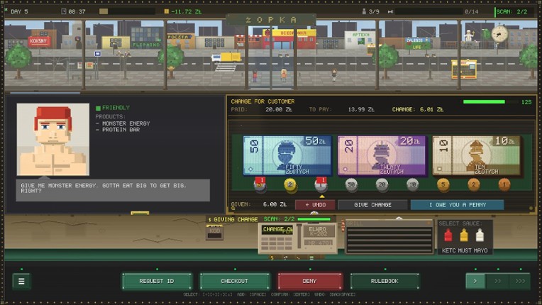 You're Kazio, an ex-coal miner, husband, father, and the newest cashier at Żopka, Poland's landmark convenience store chain. Your job is simple: serve customers, follow the rules, don't get fired. Your real job is harder: keep your family from falling apart on a cashier's wage. WORK THE REGISTER.Scan items from a catalogue of 100+ products, check IDs, grill hot dogs, count change. Easy enough unt… If you enjoyed this game, see our list of games similar to Which Sausage, Mate?.