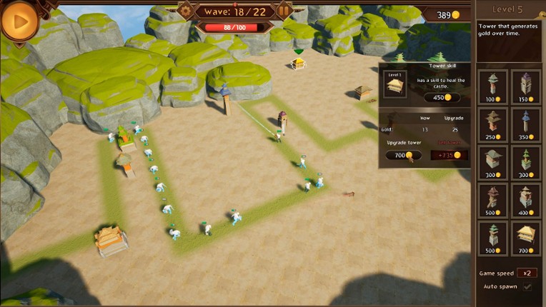A typical and addictive tower defense game. Build your towers and upgrade them to protect the castle from attacks of various monsters. Place the towers at good places so that they can reach as many monsters as possible. Features: - 18 levels to play - various types of towers and monsters - interactive tutorial If you enjoyed this game, see our list of games similar to Tower Defense New.