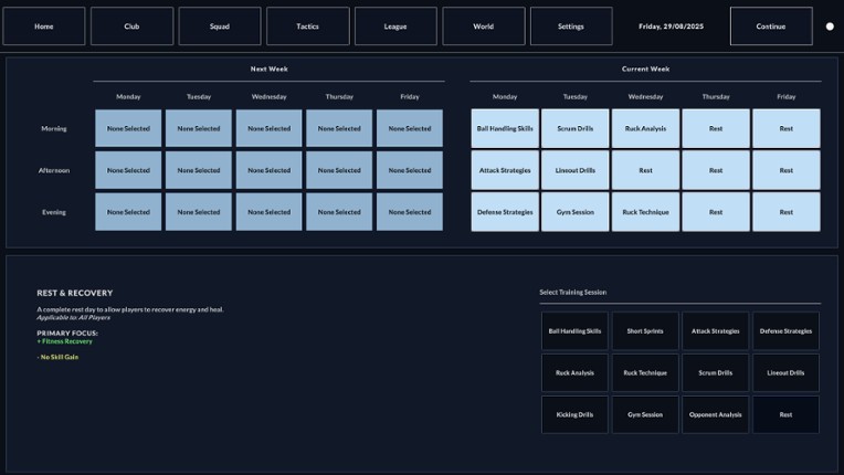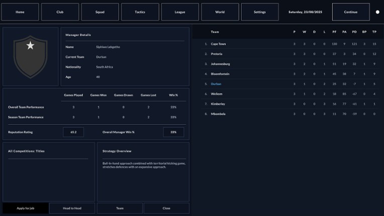 Rugby Management: School to Senior This is a management simulation that bridges the gap between school rugby and the professional senior game. The world is populated by thousands of players who start their careers at age 16 in the school leagues and progress into the full senior system. A Connected Ecosystem The game simulates a complete rugby career path. Players you see in school competition… If you enjoyed this game, see our list of games similar to Rugby Career Manager.