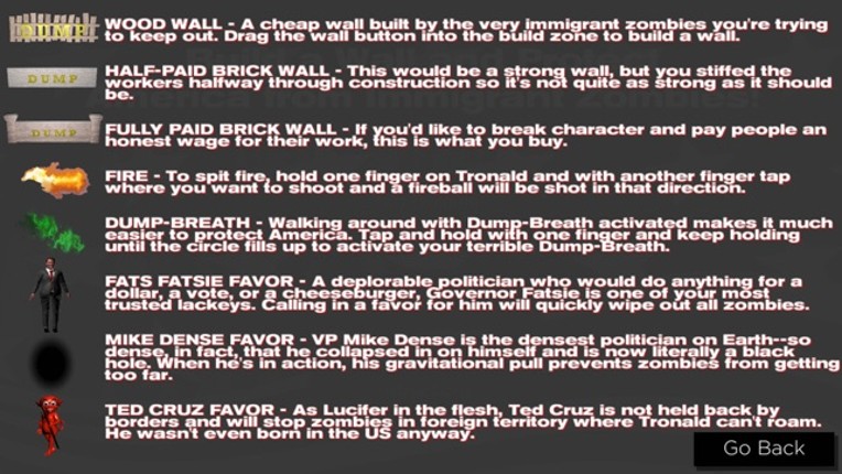 "I'm here to eat Tic-Tacs and grab people... and I'm all out of Tic-Tacs." - Tronald Dump, recorded on a hot mic In this game you play Tronald Dump, a small-handed politician who is determined to prevent immigrants from entering his country and defiling the American dream. As Tronald, you must patrol the border and build a wall to keep out illegal aliens. Every zombie immigrant that makes it into… If you enjoyed this game, see our list of games similar to Tronald Dump - Build a Wall to Save America!.