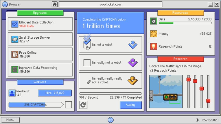 NoticeThis game is not recommended for robots. If you are a robot, proceed at your own risk. About the GameWelcome to CAPTCHA HellYour favorite idol singer Nova Hoshimiya is retiring at the height of her fame, and her farewell concert is your last chance to see her perform. The tickets are selling fast, so you rush to the ticket website… only to be hit by an endless wave of CAPTCHAs. What st… If you enjoyed this game, see our list of games similar to CAPTCHA Hell.