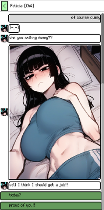 CHAPTER 4 PUBLIC RELEASE OUT NOW Chapter 5 out now on Patreon! As the boyfriend, you’ll text with your girlfriend Felicia, who’s on her way to college. But things get heated when Felicia starts sharing her exciting new life, including some unexpected company. Will you play it cool, show some jealousy, or explore where this flirty conversation can lead? With playful dialogue, unexpected twis… If you enjoyed this game, see our list of games similar to Damn That's Felicia? CHAPTER 4 UPDATE.