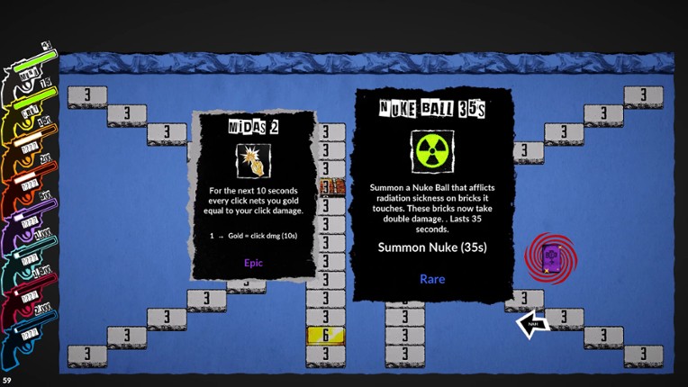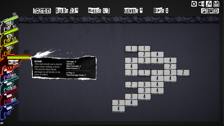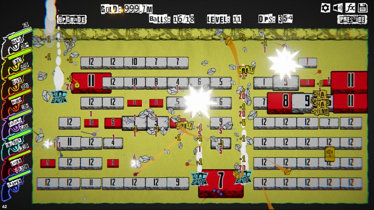 Grab your balls and get ready to bust! Ball Buster Breakout is a hyper-kinetic incremental clicker game based on the arcade classic "Breakout" and wrapped in a raw punk zine aesthetic. Aim. Fire. Obliterate. Repeat. Aim your cannon and fire one of your balls into a grid of bricks. Every brick you destroy earns gold. Gold buys upgrades and new balls. More balls means more damage,… If you enjoyed this game, see our list of games similar to Ball Buster Breakout.