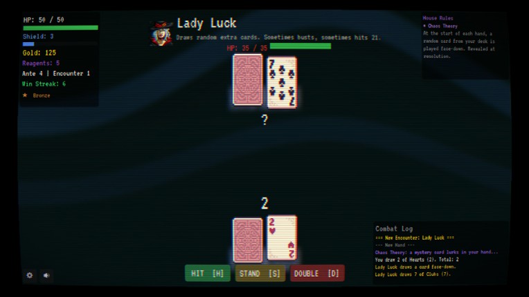 Each hand plays according to the standard rules of blackjack, but every hit, stand, or double down matters and creates a series of triggers that helps you beat the odds. Build your deck by adding new cards of different suits, all with their own perks: Spades cards will grant you additional damage Hearts cards will recover health during battles Clubs cards will increase your luck, helping y… If you enjoyed this game, see our list of games similar to RogueJack21.