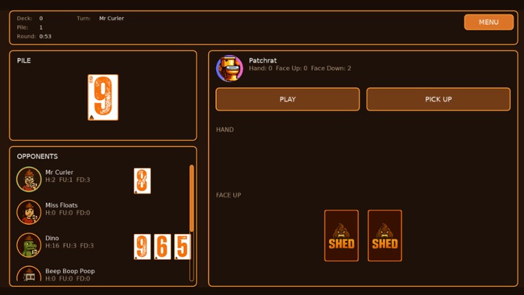 5 Flush your friends. Burn the deck. SHED everything.SHED is a competitive card-shedding game where your goal is simple: get rid of everything before your friends do. Perfect for game nights, parties, or friendly rivalry. Clever, reactive rounds with surprising turnarounds Special cards that shift the flow instantly Distinct deck styles for every personality Full offline singleplayer and mul…
