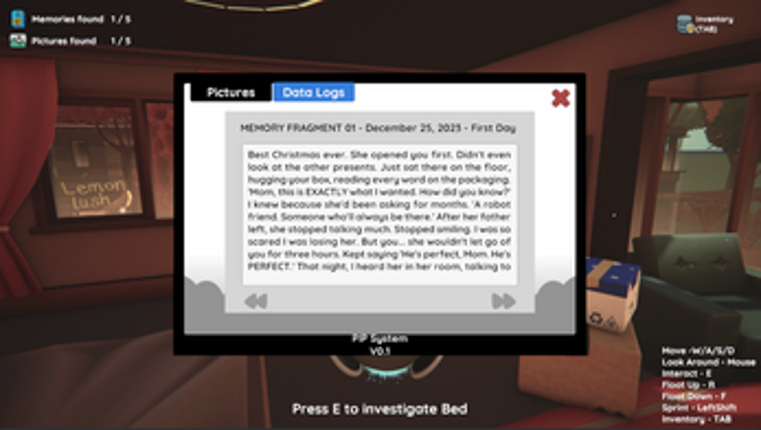 6 A tiny robot wakes up alone in an empty house. Its memory is gone. Its family is gone. All that remains are fragments of a story it must piece together. You are Pip, a small companion robot who awakens in an abandoned suburban home with no memory of what happened. As you explore the quiet rooms, you'll discover data chips containing memories, moments of joy, struggle, and heartbreak that reveal w…