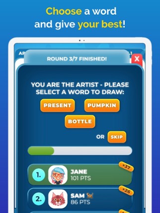 Draw & Guess is a casual drawing game for 4-16 people! Each player receives a word and draws it. The next player guesses the word behind the drawing. Then another one draws it again and so on! If the first word is correctly guessed by the last player, that's a trophy! If you enjoyed this game, see our list of games similar to Draw & Guess.