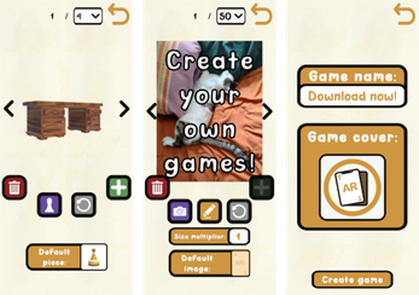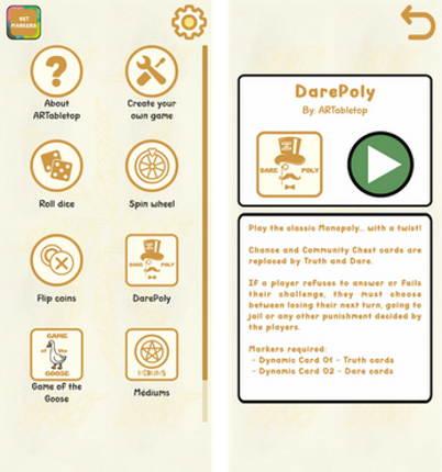 View Game7 Bring your favorite tabletop games to life with augmented reality Ever imagined playing your own tabletop games anytime, anywhere? ARTabletop makes it possible! This lightweight Android app lets you turn any surface into a game board using augmented reality. Just print a few markers and use your phone’s camera to unlock endless possibilities. Create your own tabletop games With ARTabletop’s bui…