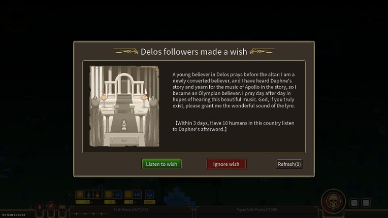In Deity's Domain, you play as a young deity born from the union of Freya's sweat and Forseti's blood during the war between the Aesir and Vanir. Your goal is to reach Asgard and claim your place among the major deities. Build and manage a civilization on a mystical island, earning the faith of your followers and competing against other supernatural forces in a world inspired by Norse mythology. … If you enjoyed this game, see our list of games similar to Deity's Domain.