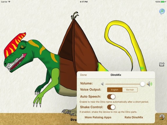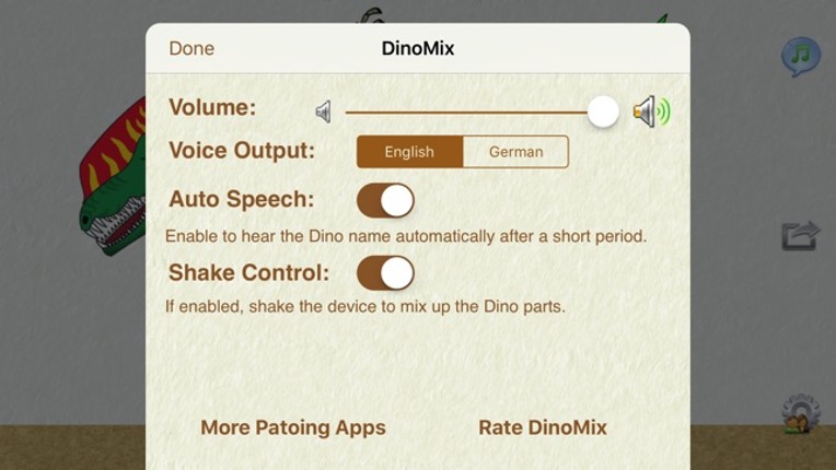 Mix up dinosaurs - Your kids will love it! Dinosaur lovers can create their favorite dino and have the new name spoken out aloud. 12 colorful dinosaurs are sliced up and can be assembled in over thousand new combinations. The scientific dinosaur name is displayed below the animal and spoken out aloud (your kids do not need to be able to read - yet) in English or German. Ideal for kids from 3 y… If you enjoyed this game, see our list of games similar to DinoMix.