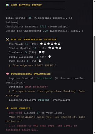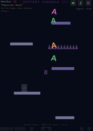 Descent Parable is a punishing precision platformer that transforms failure into dark comedy. Descend through five increasingly cruel levels - The Descent, The Deeper Dark, The Abyss, The Void, and The End - each introducing new ways to die and new reasons to question your life choices. Play the Demo above, containing level 1, or support our game by buying the full 5 levels Down Below :) Featu… If you enjoyed this game, see our list of games similar to Descent Parable - Rage-Bait Edition!.