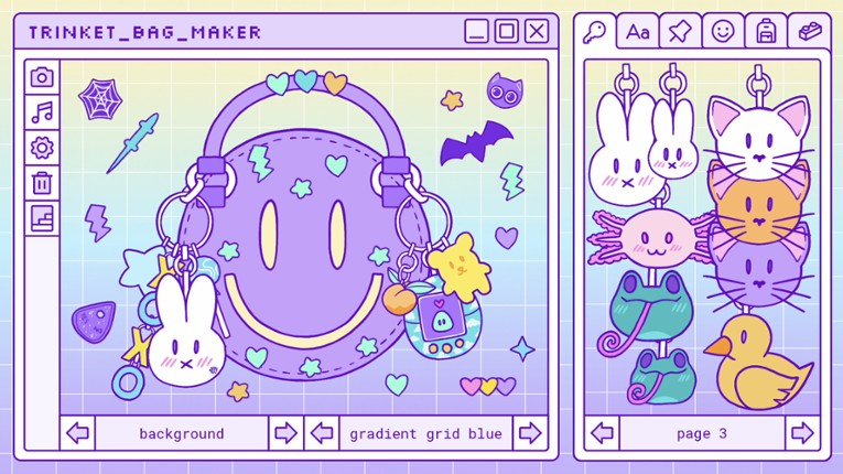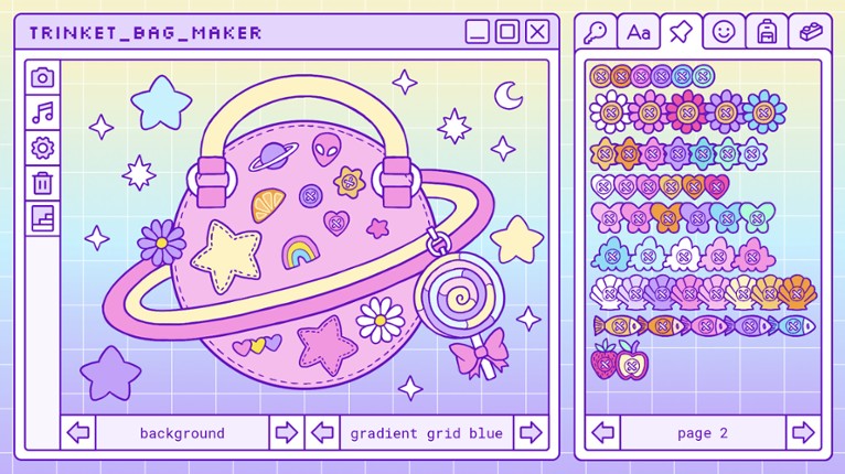 Trinket Bag Maker is a retro sandbox game inspired by the 2000's girl games, where you can create your own trinket bag! Choose between many adorable charms and bags to create the trinket bag of your dreams! If you enjoyed this game, see our list of games similar to Trinket Bag Maker.