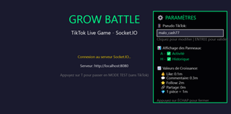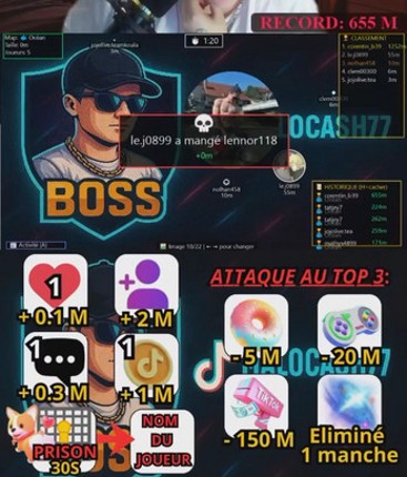 View Game4 RÈGLES DU GROW BATTLE OBJECTIF DU JEU Incarnez un cercle représentant votre profil TikTok ! Grandissez, attaquez, survivez et tentez de finir dans le TOP 3 avant la fin d'une manche de 5 minutes ⏳ 1. GRANDIR (GAGNER DES MÈTRES) Faites grossir votre cercle grâce aux actions TikTok : • Tapoter → +0,1 m • ⭐ Follow → +2 m • Commentaire → +0,3 m • Pièce → +1 m Votre PP devient visible aux au…