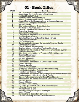 Pre-rolled results from Ennead Games gens and PDFs The Helpful List Compilation Series (previously also called the Arbitrary series) covers a range of genres and topics, all d100 tables, using Ennead Games numerous hand made generators help. There might be names for NPCs or characters, concepts for items, quick descriptions (of one or two words) for creatures or a myriad of other topics and id… If you enjoyed this game, see our list of games similar to Helpful List Compilation Volume 1.