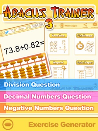 Abacus Trainer 3 is a question generator focusing on the skills acquired in division and negative numbers. It provides a whole range of options that can be flexibly selected to fit the drilling needs. Users are able to practise on every aspect of abacus division, decimals and rounding techniques learnt in Book 2, as well as negative numbers learnt in Book 3. Flexible answer input can be entered ei… If you enjoyed this game, see our list of games similar to Abacus Trainer 3.