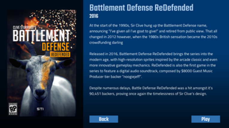 1 30%Game Brain Score30% User Score 1 reviewsBritain's Top Game Designer is Back! The world's most prominent designer, Sir Clive Sturridge is back in this brand new collection of 5 games from his iconic Battlement Defence series of games. Follow Sir Sir Clive's career, from his humble beginnings making games for the ZX Spectrum, through to his crowdfunded revival, and look into the future as Sir Clive dives into high-concept indie gaming. …