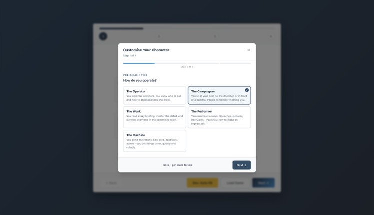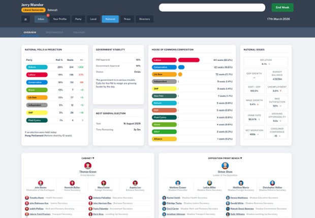 Welcome to British politics. The real version.Not a visual novel. Not a quiz game with branching choices. This is a systems-driven political career simulator where 20,000+ NPCs – each with names, faces, personalities, ambitions, and voting records – pursue their own goals alongside you. Start as a local councillor. Build your reputation. Climb to Westminster. The simulation responds to what you d… If you enjoyed this game, see our list of games similar to UK Politics Simulator.