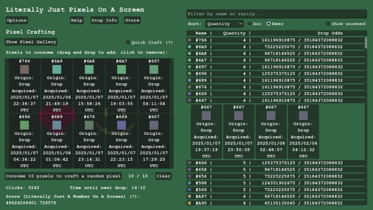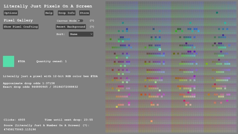 Welcome to Literally Just Pixels On A Screen. In this "game" you get to collect pixels. That's it. Leave the game open and every hour you will be dropped a random pixel. Different pixels have different drop rates. Pixels will appear as items in your Steam inventory, are tradable, and can be bought/sold on the Steam Community Market. You can also craft 10 pixels into a single random pi… If you enjoyed this game, see our list of games similar to Literally Just Pixels On A Screen.