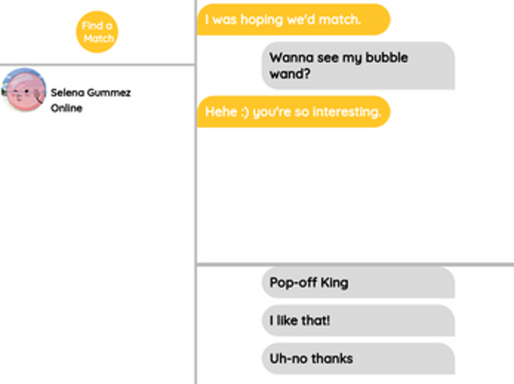 Gameplay Explanation Left Click to Select MessagesCollect the words to expand your chances of wooing the right bubble on a date.Charm your matches to acquire higher quality responses, which leads to better matches. The rarer the words, the better they'll go over, but be careful not all words are pleasing to every bubble. Meet Our Characters Bubblegum is a romantic kind of bubble, looking for th… If you enjoyed this game, see our list of games similar to Bubble: Dating App for the Well-Rounded.