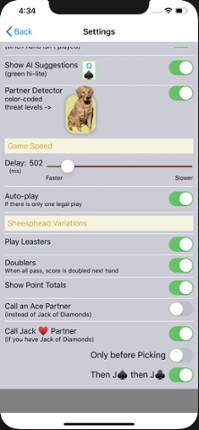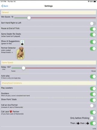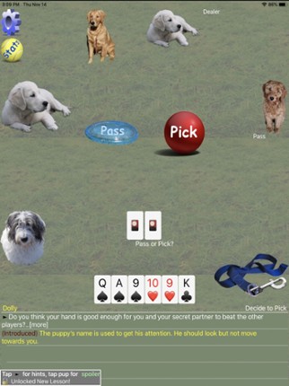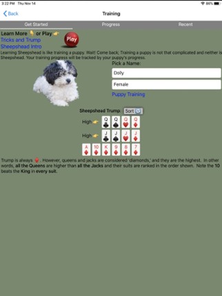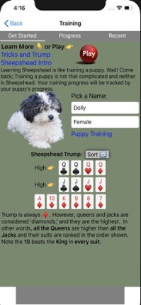 Classic Sheepshead card game...and puppies! New! Multiplayer, This is a 5 player game with any combination of friends and/or AI bots. An advanced AI focuses first on bringing in new players to the game; pick up the game and just start playing. Training progresses quickly, and even the most experienced players might learn a thing or two. Each strategic decision is explained! See inside the thou… If you enjoyed this game, see our list of games similar to K9 Sheepshead: Schafkopf.
