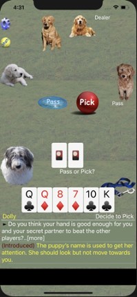 Classic Euchre card game...and puppies! This is a 4 player game with any combination of friends and/or AI bots. An advanced AI focuses first on bringing in new players to the game; pick up the game and just start playing. Training progresses quickly, and even the most experienced players might learn a thing or two. Each strategic decision is explained! See inside the thought process of a matur… If you enjoyed this game, see our list of games similar to K9 Euchre.