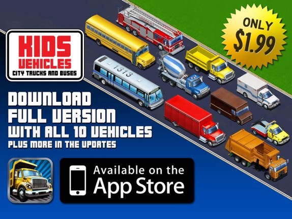 Interactive trucks for kids! Play with them like with die-cast model This app contains 3 high detailed vehicles with interactive functions to play with: * school bus with opening door * dump truck with working open-box bed * ambulance with siren and horn + all vehicles have working wipers and front lights! Highly detailed graphics and realistic sounds of engines, brakes, sirens, hydraulics etc… If you enjoyed this game, see our list of games similar to Kids Vehicles: City Trucks & Buses HD Lite.