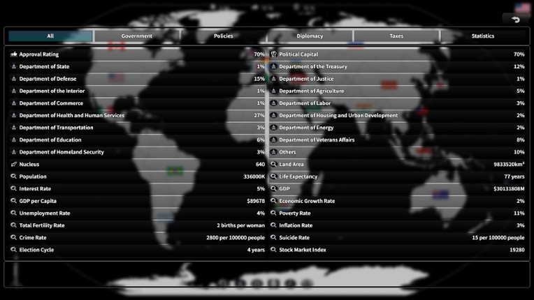 7 Take on the role of President (or Prime Minister) and manage the government, policy, taxes, military, and diplomacy. Answer voters' questions about key debated policies and engage with voters. Demonstrate leadership to protect the nation from crises such as war, nuclear threats, terrorism, and pandemics. The goal is to win the election and continue your journey. Features 2000 Mode and 202…