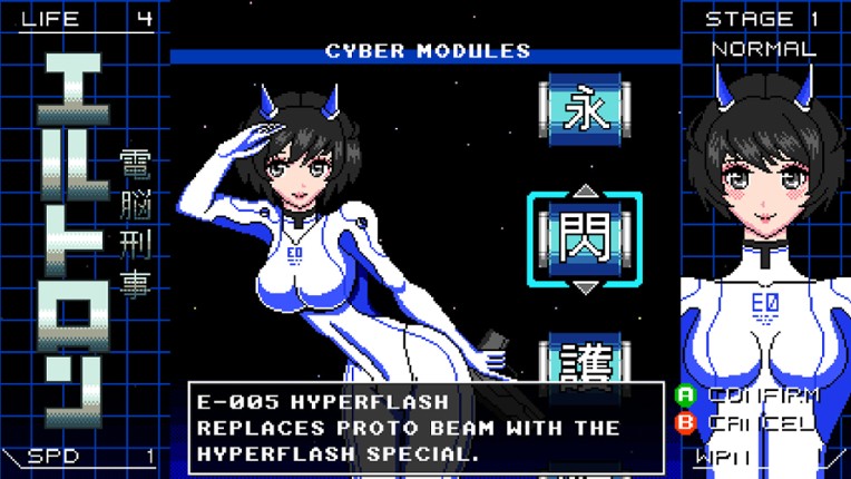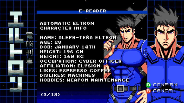 A side-scrolling shoot 'em up inspired by 8-bit games and 80s Sci-Fi movies. Play as Automatic Eltron, a cybernetic law enforcer, and save the city from the machine domination. FIGHT FOR THE FUTURE IN THE DISTANT YEAR OF 20XX The MASTER PROGRAM, which controls all machines, has gone insane and now coordinates attacks against cities around the world. Faced with this metallic threat, the cyber… If you enjoyed this game, see our list of games similar to Automatic Eltron.