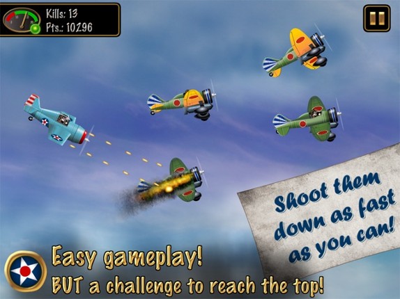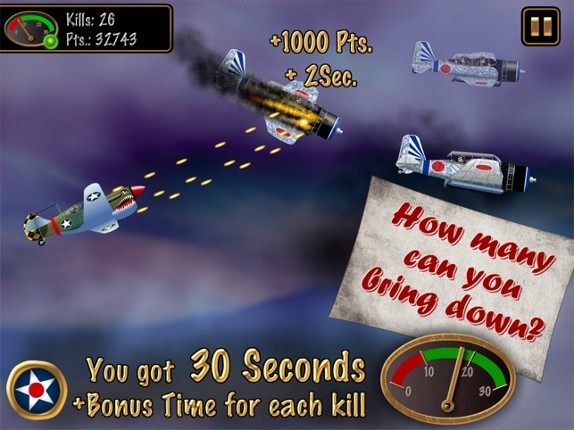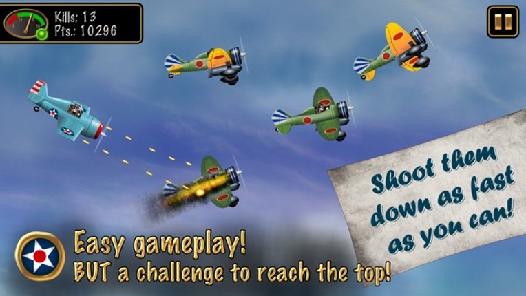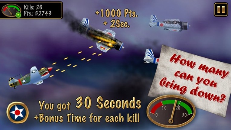 Just shoot! Shoot down as many enemy planes as you can in 30 seconds. Bonus time for each kill! Shoot down Zeros and many other Japanese planes! Different planes with different fire-power! Upgrades for each plane! Be the ace of aces in the Game Center highscore! Simple steering, NO gun jam, permanent shooting possible, pure shooting joy! Unlock more planes with your total kills: Wildcat - W… If you enjoyed this game, see our list of games similar to American Hero - 30 Seconds in the Pacific War.