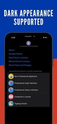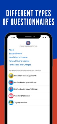 LTO Driver's License Exam Reviewer App lets you help to pass the Driver's License Examination by learning different road and traffic signs with practice questionnaires. Features: - Less than 4MB only! - Up to Date Questions - Minimalist and Clean User Interface - Works offline - Test Exams by Type of Exam - Rating Result for every completed exams - Detailed Information about Driver's License (Qua… If you enjoyed this game, see our list of games similar to LTO Driver's Exam Reviewer.