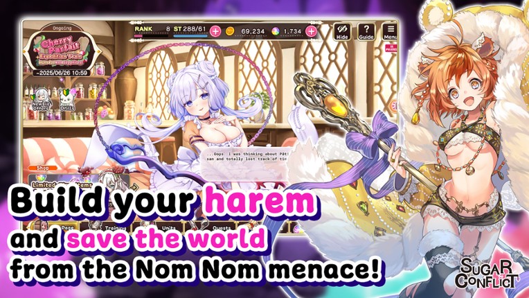 Sugar Conflict is a hybrid turn-based RPG and visual novel packed with strategy and hot anime ladies, featuring over 60 recruitable heroines, 200 character-specific story episodes, and 100 unlockable sex scenes at launch. Upgrade your girls and gear and immerse yourself in a sugar-coated war filled with high-stakes battles and even higher body counts!New girls, fresh storylines, and even hot… If you enjoyed this game, see our list of games similar to Sugar Conflict.